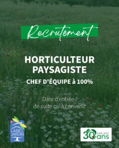 NOUS RECRUTONS – CHEF D’ÉQUIPE PAYSAGISTE (H/F) à 100% Pour renforcer nos équipes, Arnaud Cachin Paysagiste Sàrl recherche un(e) horticulteur-trice / paysagiste – chef d’équipe. Votre profil :• CFC de
